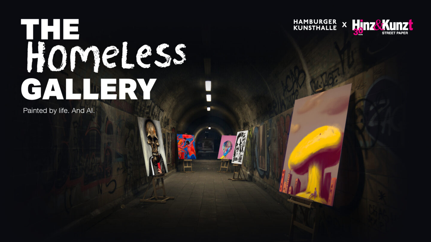 Beneath bridges, in subways and at train stations – The Homeless Gallery was just as unsheltered as its artists. Over 100,000 Hamburg residents and tourists visited the 13 open-air exhibition venues throughout the city. Each location was announced in real-time on the social media of Hinz&Kunzt and the Hamburg Kunsthalle, via hyper-localised and contextual DOOH and on The Homeless Gallery’s website.